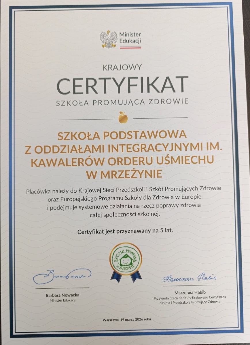 20 marca 2026 roku Pani dyrektor Małgorzata Skoneczna wraz ze szkolnym koordynatorem programu SzPZ, panią Sandrą Bemsz-Mickiewicz, odebrały Krajowy Certyfikat Szkoły Promującej Zdrowie z rąk pani wiceminister Pauliny Piechny-Więckiewicz podczas uroczystej gali w siedzibie Ministerstwa Edukacji Narodowej.